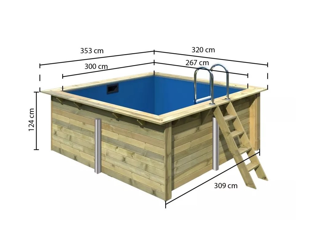 Hledáte dokonalý letní zážitek pro celou rodinu? Pořiďte si bazén KARIBU model 1 a užijte si letní radovánky bez konce, od prémiového německého výrobce Karibu Holztechnik GmbH. Představte si horký letní den, slunce pálí a vy toužíte po osvěžení. S bazénem KARIBU model 1 se váš sen stane realitou. Vychutnejte si chladivou vodu a unikněte letnímu vedru v pohodlí vlastní zahrady. Bazén KARIBU model 1 s rozměry 3,5 x 3,2 m nabízí dostatek prostoru pro hry a zábavu pro celou rodinu. Děti mohou dovádět ve vodě, zatímco vy si budete užívat relaxaci na lehátku s osvěžujícím koktejlem v ruce. Bazén KARIBU model 1 má objem pro cca 8 800 litrů vody a výšku hladiny max. 1,11 m. Obsahem balení je vnější dřevěný žebřík ze severského smrku a žebřík z nerezové oceli vám usnadní vstup do chladné vody. Konstrukce bazénu je z dřevěných profilů se systémem dvojité pero / drážka o síle 44 mm. Vnitřní prostor je vyplněn pevnou modrou PVC fólií o tloušťce 0,6 mm. Speciální tlaková impregnace KDI třídy 4 - bazén lze instalovat do země. Bazén KARIBU model 1 se snoubí s nejlepší funkčností a jedinečným designem. Vyznačuje se vysokou úrovní dílenského zpracování.
