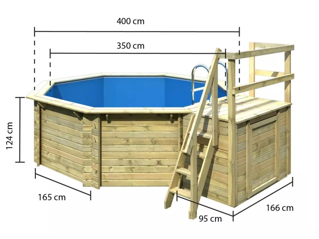 Hledáte dokonalý letní zážitek pro celou rodinu? Pořiďte si bazén osmihranný KARIBU model 1B a užijte si letní radovánky bez konce, od prémiového německého výrobce Karibu Holztechnik GmbH. Představte si horký letní den, slunce pálí a vy toužíte po osvěžení. S bazénem KARIBU model 1B se váš sen stane realitou. Vychutnejte si chladivou vodu a unikněte letnímu vedru v pohodlí vlastní zahrady. Bazén KARIBU model 1B s rozměry 4,80 x 4,00 m nabízí dostatek prostoru pro hry a zábavu pro celou rodinu. Děti mohou dovádět ve vodě, zatímco vy si budete užívat relaxaci na lehátku s osvěžujícím koktejlem v ruce. Bazén KARIBU model 1B má objem pro cca 11 000 litrů vody a výšku hladiny max. 1,11 m. Obsahem balení je terasa s integrovanou technickou místností 166 x 95 cm, vnější dřevěný žebřík ze severského smrku a žebřík z nerezové oceli vám usnadní vstup do chladné vody. Konstrukce bazénu je z dřevěných profilů se systémem dvojité pero / drážka o síle 38 mm. Vnitřní prostor je vyplněn pevnou modrou PVC fólií o tloušťce 0,6 mm. Bazén KARIBU model 1B se snoubí s nejlepší funkčností a jedinečným designem. Vyznačuje se vysokou úrovní dílenského zpracování.