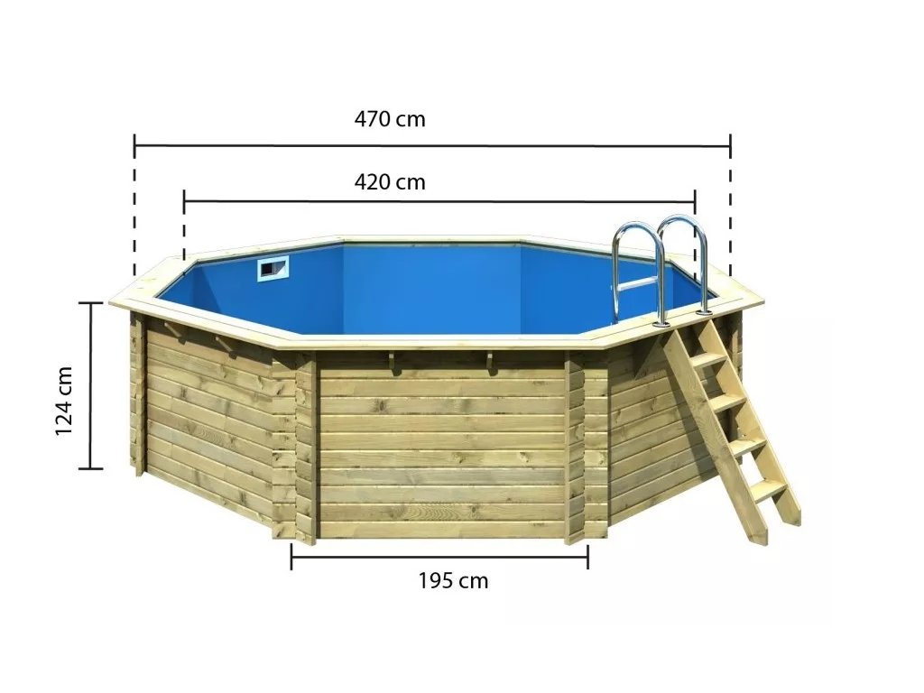 Zahradní bazén s vnější rozměry 4,7 x 4,7 x 1, 24 m a hloubce 1,11 m, včetně vnějších dřevěných a vnitřních nerezových schůdků. Konstrukce bazénu z dřevěných profilů síly 38 mm.  Vnitřní prostor je vyplněn pevnou modrou PVC fólií o síle 0,6 mm. Objem vody 16 000 L. Rohy bazénu vyztuženy nerezovými prvky. Barva: přírodní. Doba dodání: 7 - 8 týdnů.