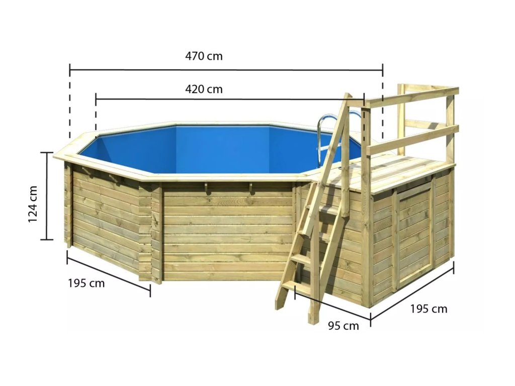 Zahradní bazén s vnější rozměry 5,5 x 4,7 x 1,24 m a hloubce 1,11 m, včetně terasy s integrovanou technickou místností, vnějších dřevěných a vnitřních nerezových schůdků. Konstrukce bazénu z dřevěných profilů síly 38 mm.  Vnitřní prostor je vyplněn pevnou modrou PVC fólií o síle 0,6 mm. Objem vody 16 000 L. Barva: přírodní. Doba dodání: 7 - 8 týdnů.