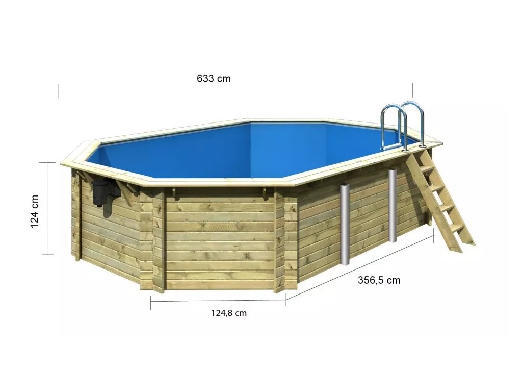 Zahradní bazén s vnější rozměry 6,1 x 4,0 x 1,24 m a hloubce 1,11 m, včetně vnějších dřevěných a vnitřních nerezových schůdků. Rohy bazénu jsou vyztuženy nerezovými prvky. Konstrukce bazénu z dřevěných profilů síly 38 mm.  Vnitřní prostor je vyplněn pevnou modrou PVC fólií o síle 0,6 mm. Objem vody 19 000 L. Barva: přírodní. Vyrobeno: Německo. Doba dodání: 2 - 3 týdny.