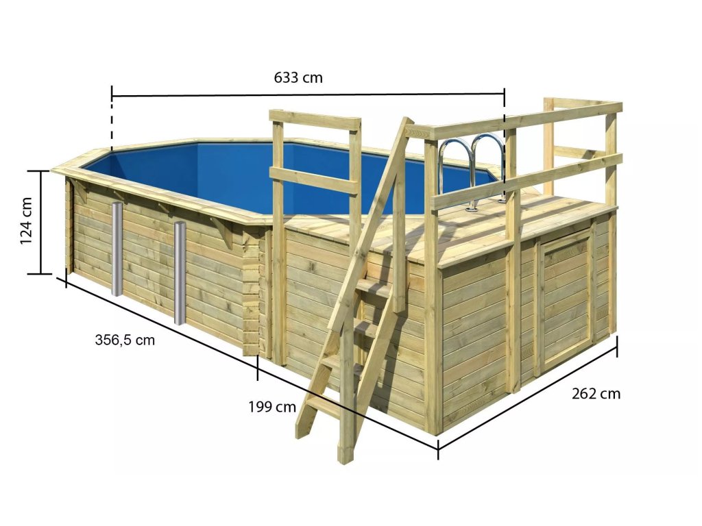 Konstrukce bazénu je vyrobena z dřevěných profilů (systém dvojité pero / drážka) síly 38 mm. Vnitřní prostor je vyplněn pevnou modrou PVC fólií o síle 0,6 mm.