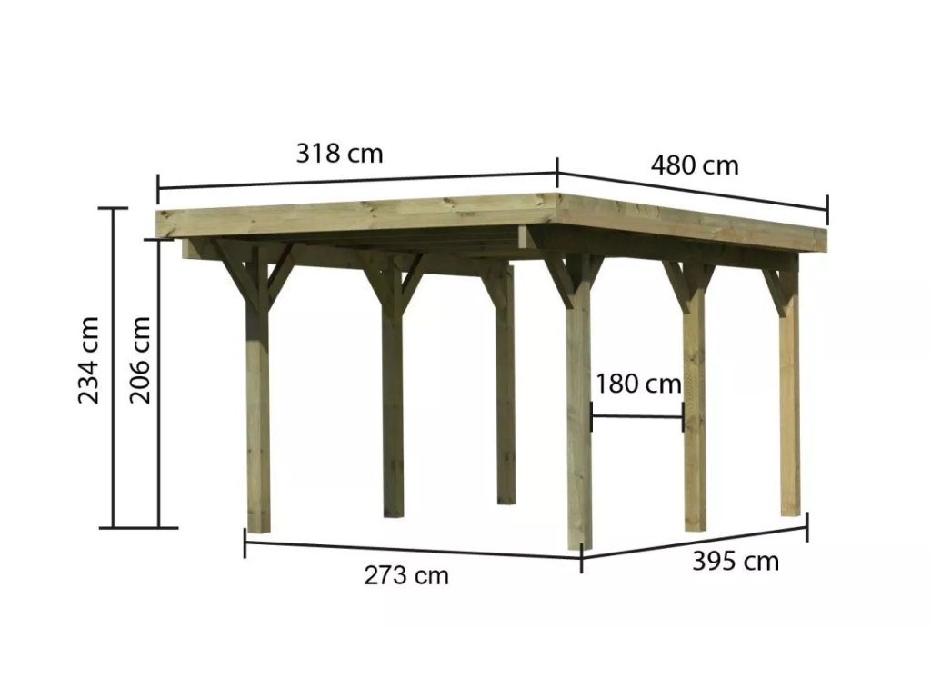 Přístřešek na auto - obdélníkový tvar a svými rozměry vyhovuje většině modelů vozidel běžných na českém trhu. Celková zastřešená plocha je 3,18 x 4,80 m. Průjezdná výška je 206 cm. Střechu podpírá šest dřevěných sloupků 11,5 x 11,5 cm. Konstrukce přístřešku je tlakově impregnována a je tak dobře chráněna proti dřevokazným houbám i hmyzu, ale i proti nepříznivým povětrnostním podmínkám. Impregnace je zdravotně nezávadná a naprosto bezpečná. Vzhledem k velkým plochám střechy a zatížení větrem je nutné připevnit přístřešek k zemi pomocí odpovídajících zemních kotev (nejsou obsahem dodávky - lze dokoupit jako příplatkové příslušenství).