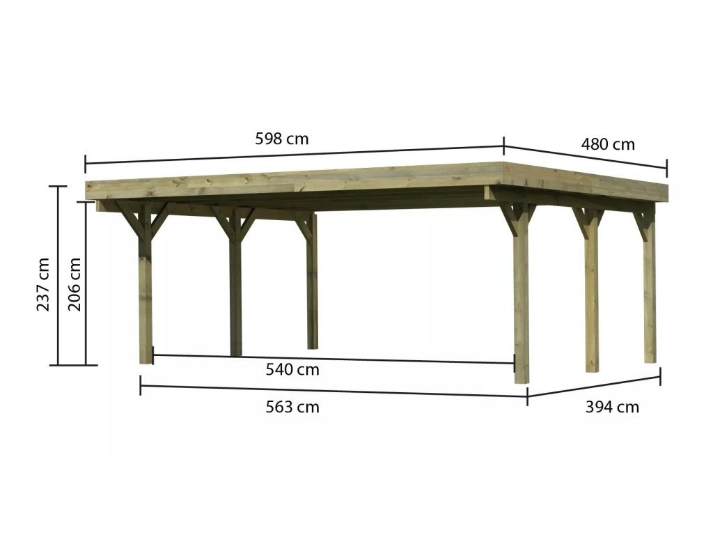 Přístřešek na auto - obdélníkový tvar a svými rozměry vyhovuje většině modelů vozidel běžných na českém trhu. Celková zastřešená plocha je 5,98 x 4,80 m. Průjezdná výška je 206 cm. Střechu podpírá šest dřevěných sloupků 11,5 x 11,5 cm. Konstrukce přístřešku je tlakově impregnována a je tak dobře chráněna proti dřevokazným houbám i hmyzu, ale i proti nepříznivým povětrnostním podmínkám. Impregnace je zdravotně nezávadná a naprosto bezpečná. Vzhledem k velkým plochám střechy a zatížení větrem je nutné připevnit přístřešek k zemi pomocí odpovídajících zemních kotev (nejsou obsahem dodávky - lze dokoupit jako příplatkové příslušenství).