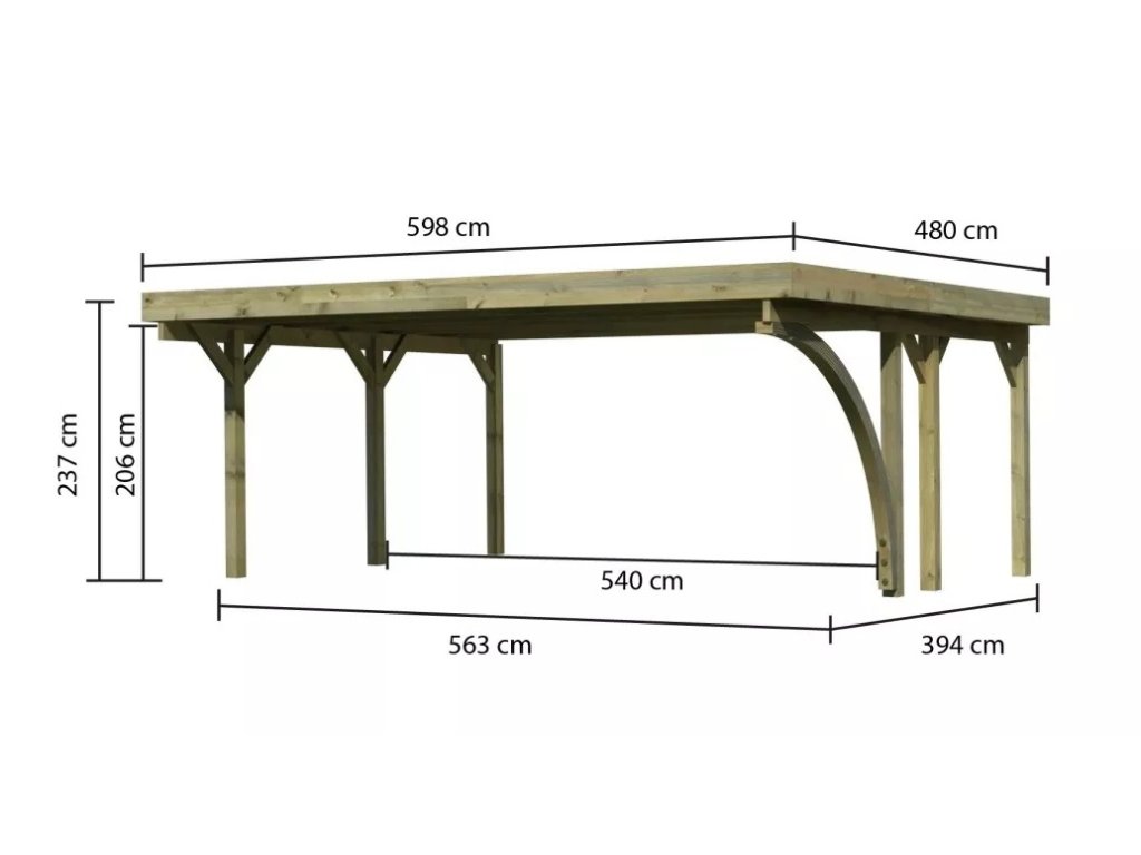 Přístřešek na auto - obdélníkový tvar a svými rozměry vyhovuje většině modelů vozidel běžných na českém trhu. Celková zastřešená plocha je 5,98 x 4,80 m. Průjezdná výška je 206 cm. Střechu podpírá šest dřevěných sloupků 11,5 x 11,5 cm. Konstrukce přístřešku je tlakově impregnována a je tak dobře chráněna proti dřevokazným houbám i hmyzu, ale i proti nepříznivým povětrnostním podmínkám. Impregnace je zdravotně nezávadná a naprosto bezpečná. Vzhledem k velkým plochám střechy a zatížení větrem je nutné připevnit přístřešek k zemi pomocí odpovídajících zemních kotev (nejsou obsahem dodávky - lze dokoupit jako příplatkové příslušenství).