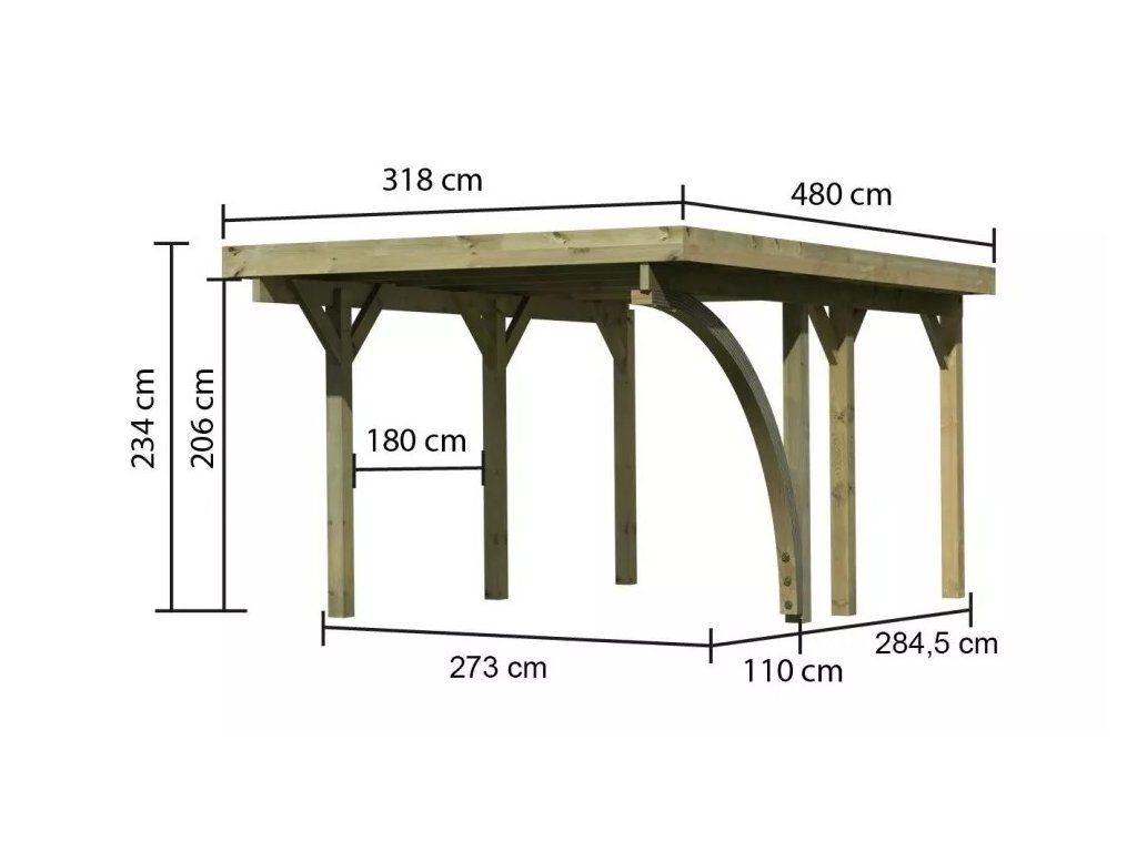 Přístřešek na auto - obdélníkový tvar a svými rozměry vyhovuje většině modelů vozidel běžných na českém trhu. Celková zastřešená plocha je 3,18 x 4,80 m. Průjezdná výška je 206 cm. Střechu podpírá šest dřevěných sloupků 11,5 x 11,5 cm. Konstrukce přístřešku je tlakově impregnována a je tak dobře chráněna proti dřevokazným houbám i hmyzu, ale i proti nepříznivým povětrnostním podmínkám. Impregnace je zdravotně nezávadná a naprosto bezpečná. Vzhledem k velkým plochám střechy a zatížení větrem je nutné připevnit přístřešek k zemi pomocí odpovídajících zemních kotev (nejsou obsahem dodávky - lze dokoupit jako příplatkové příslušenství).