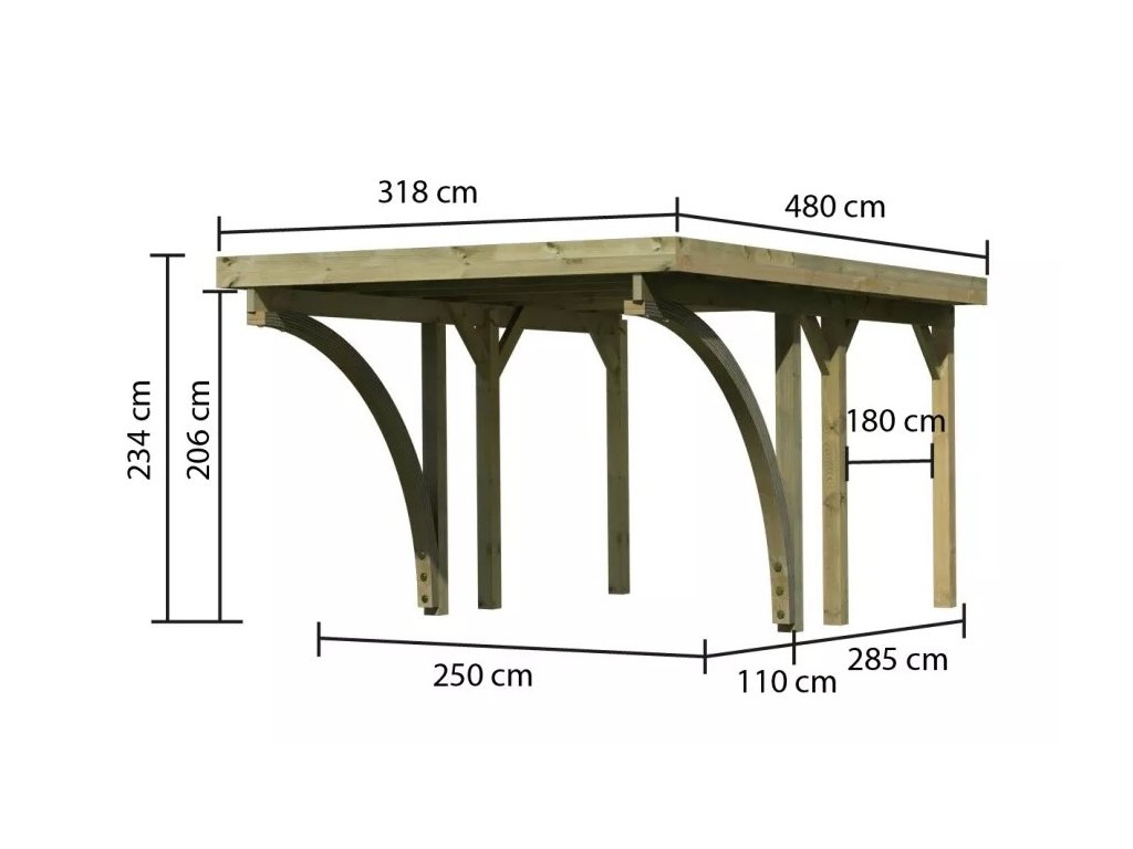 Přístřešek na auto - obdélníkový tvar a svými rozměry vyhovuje většině modelů vozidel běžných na českém trhu. Celková zastřešená plocha je 3,18 x 4,80 m. Průjezdná výška je 206 cm. Střechu podpírá šest dřevěných sloupků 11,5 x 11,5 cm. Konstrukce přístřešku je tlakově impregnována a je tak dobře chráněna proti dřevokazným houbám i hmyzu, ale i proti nepříznivým povětrnostním podmínkám. Impregnace je zdravotně nezávadná a naprosto bezpečná. Vzhledem k velkým plochám střechy a zatížení větrem je nutné připevnit přístřešek k zemi pomocí odpovídajících zemních kotev (nejsou obsahem dodávky - lze dokoupit jako příplatkové příslušenství).
