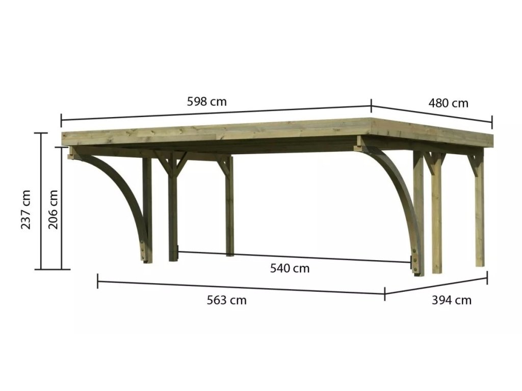 Přístřešek na auto - obdélníkový tvar a svými rozměry vyhovuje většině modelů vozidel běžných na českém trhu. Celková zastřešená plocha je 5,98 x 4,80 m. Průjezdná výška je 206 cm. Střechu podpírá šest dřevěných sloupků 11,5 x 11,5 cm. Konstrukce přístřešku je tlakově impregnována a je tak dobře chráněna proti dřevokazným houbám i hmyzu, ale i proti nepříznivým povětrnostním podmínkám. Impregnace je zdravotně nezávadná a naprosto bezpečná. Vzhledem k velkým plochám střechy a zatížení větrem je nutné připevnit přístřešek k zemi pomocí odpovídajících zemních kotev (nejsou obsahem dodávky - lze dokoupit jako příplatkové příslušenství).