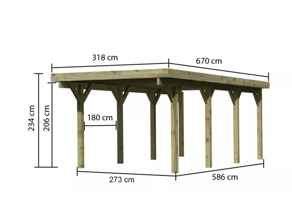 Přístřešek na auto - obdélníkový tvar a svými rozměry vyhovuje většině modelů vozidel běžných na českém trhu. Celková zastřešená plocha je 3,18 x 6,70 m. Průjezdná výška je 206 cm. Střechu podpírá osm dřevěných sloupků 11,5 x 11,5 cm. Konstrukce přístřešku je tlakově impregnována a je tak dobře chráněna proti dřevokazným houbám i hmyzu, ale i proti nepříznivým povětrnostním podmínkám. Impregnace je zdravotně nezávadná a naprosto bezpečná. Vzhledem k velkým plochám střechy a zatížení větrem je nutné připevnit přístřešek k zemi pomocí odpovídajících zemních kotev (nejsou obsahem dodávky - lze dokoupit jako příplatkové příslušenství).