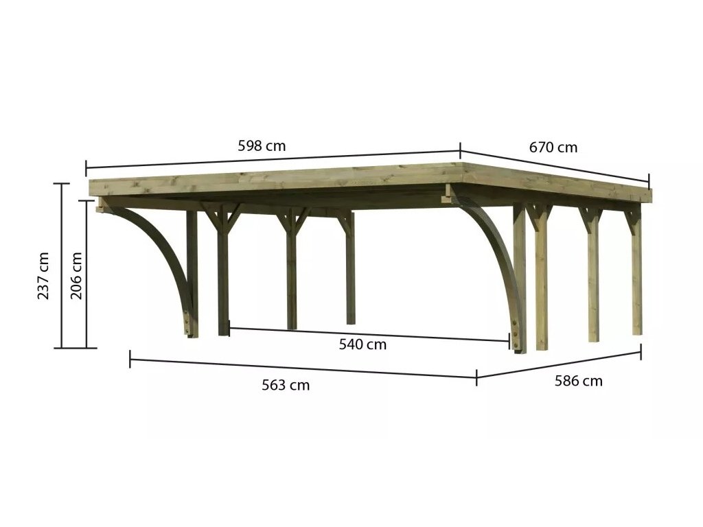 Dřevěný přístřešek na auto, š 5,63 x d 5,86 x v 2,37 m, zastřešená plocha 33 m2. Tento model přístřešku obsahuje dva vjezdové oblouky, které výrazně ulehčují vjezd pod přístřešek z obou stran. Německá kvalita od prémiového německého výrobce Karibu Holztechnik GmbH. Doba dodání: 2 - 3 týdny.