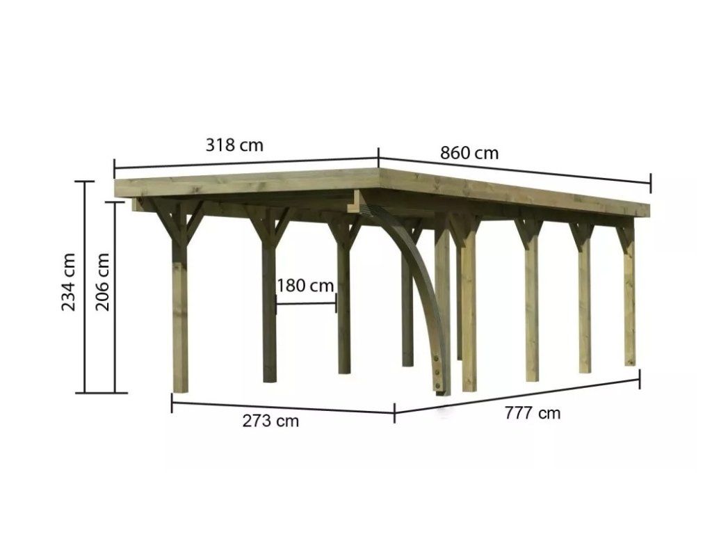 Přístřešek na auto - obdélníkový tvar a svými rozměry vyhovuje většině modelů vozidel běžných na českém trhu. Celková zastřešená plocha je 3,18 x 8,60 m. Průjezdná výška je 206 cm. Střechu podpírá deset dřevěných sloupků 11,5 x 11,5 cm. Konstrukce přístřešku je tlakově impregnována a je tak dobře chráněna proti dřevokazným houbám i hmyzu, ale i proti nepříznivým povětrnostním podmínkám. Impregnace je zdravotně nezávadná a naprosto bezpečná. Vzhledem k velkým plochám střechy a zatížení větrem je nutné připevnit přístřešek k zemi pomocí odpovídajících zemních kotev (nejsou obsahem dodávky - lze dokoupit jako příplatkové příslušenství).