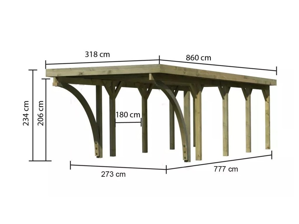 Přístřešek na auto - obdélníkový tvar a svými rozměry vyhovuje většině modelů vozidel běžných na českém trhu. Celková zastřešená plocha je 3,18 x 8,60 m. Průjezdná výška je 206 cm. Střechu podpírá deset dřevěných sloupků 11,5 x 11,5 cm. Konstrukce přístřešku je tlakově impregnována a je tak dobře chráněna proti dřevokazným houbám i hmyzu, ale i proti nepříznivým povětrnostním podmínkám. Impregnace je zdravotně nezávadná a naprosto bezpečná. Vzhledem k velkým plochám střechy a zatížení větrem je nutné připevnit přístřešek k zemi pomocí odpovídajících zemních kotev (nejsou obsahem dodávky - lze dokoupit jako příplatkové příslušenství).