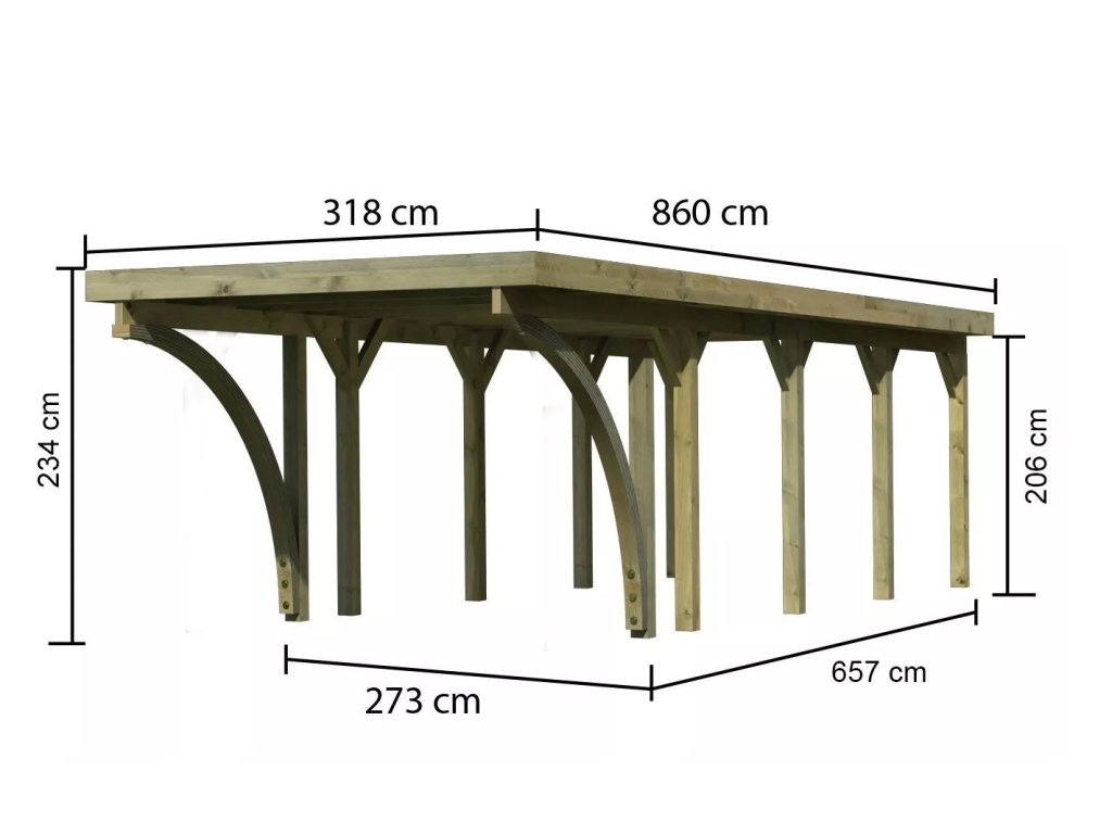Přístřešek na auto - obdélníkový tvar a svými rozměry vyhovuje většině modelů vozidel běžných na českém trhu. Celková zastřešená plocha je 3,18 x 8,60 m. Průjezdná výška je 206 cm. Střechu podpírá deset dřevěných sloupků 11,5 x 11,5 cm. Konstrukce přístřešku je tlakově impregnována a je tak dobře chráněna proti dřevokazným houbám i hmyzu, ale i proti nepříznivým povětrnostním podmínkám. Impregnace je zdravotně nezávadná a naprosto bezpečná. Vzhledem k velkým plochám střechy a zatížení větrem je nutné připevnit přístřešek k zemi pomocí odpovídajících zemních kotev (nejsou obsahem dodávky - lze dokoupit jako příplatkové příslušenství).
