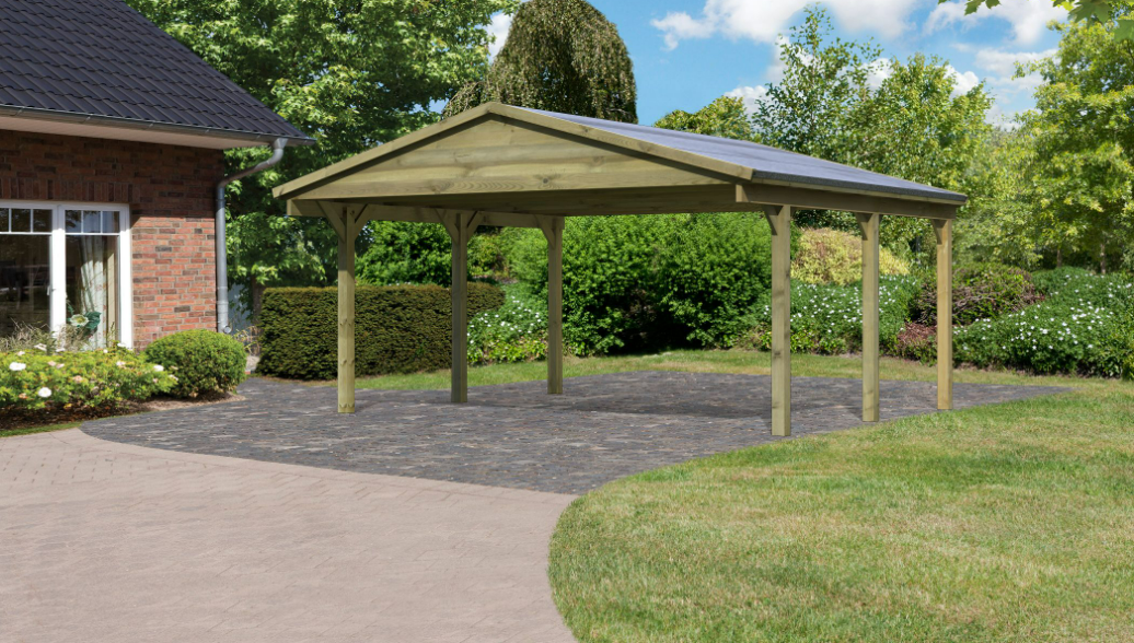 Dřevěný samostatně stojící přístřešek pro auto se sedlovou střechou, s osmi dřevěnými sloupky 12 x 12 cm vyrobený v Německu firmou KARIBU...