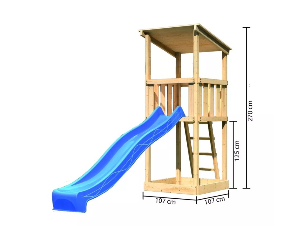Dětské hřiště, vnější rozměry š 107 x d 107 x v 270 cm s modrou skluzavkou a prostorem pro pískoviště. Německá kvalita od prémiového německého výrobce Karibu Holztechnik GmbH. Doba dodání: 2 - 3 týdny.