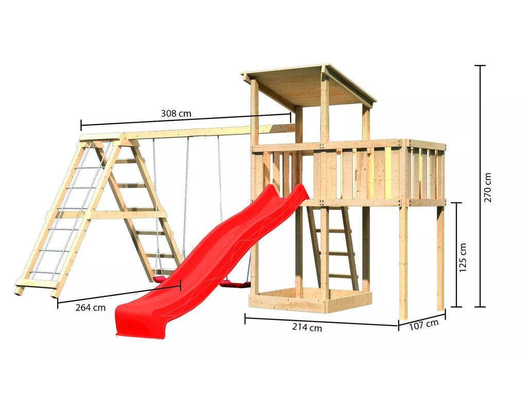 Dětské hřiště KARIBU ANNA - červená skluzavka, dvakrát houpačka, pískoviště a žebřík