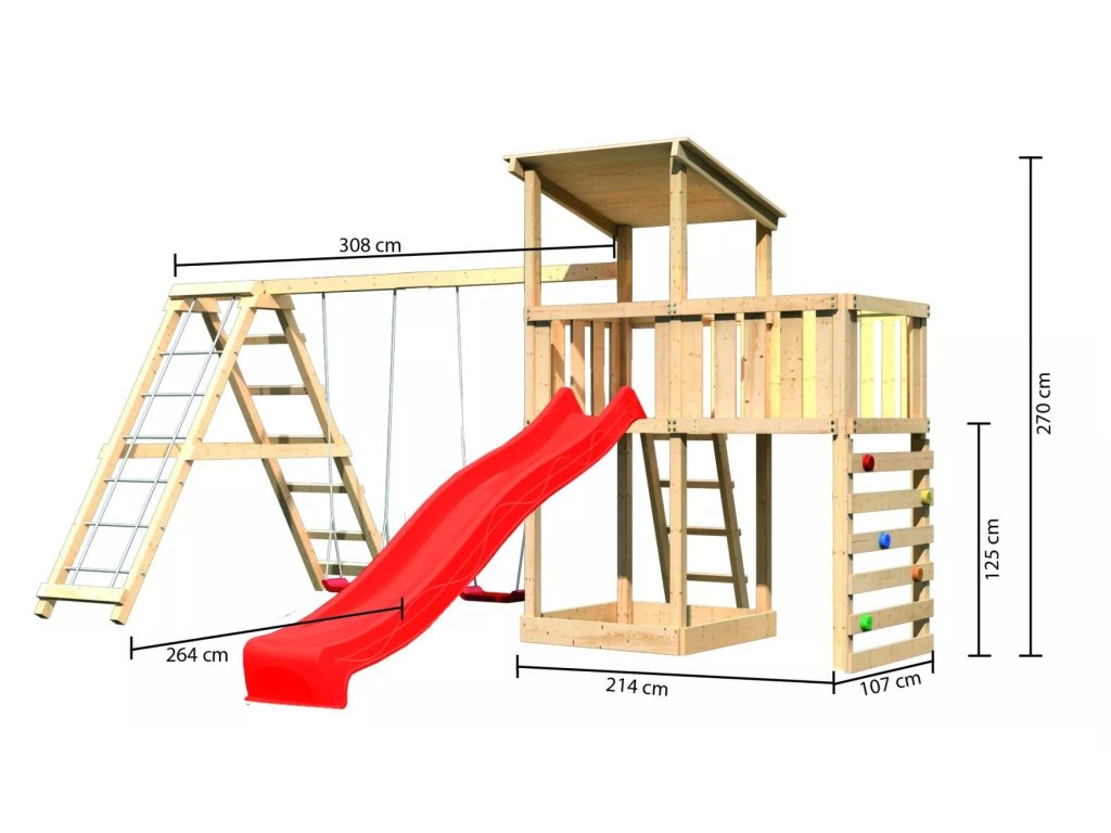 Dětské hřiště, půdorys 522 x 264 cm, věž 214 x 107 x 270 cm, červená skluzavka, dvakrát houpačka, pískoviště a žebřík. Německá kvalita od prémiového německého výrobce Karibu Holztechnik GmbH. Doba dodání: 4 - 5 týdnů.