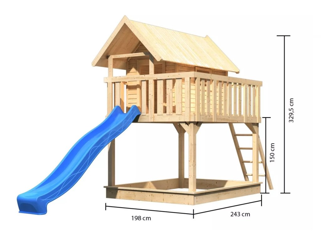 Dětské hřiště, vnější rozměry š 198 x d 244 x v 329 cm, modrá skluzavka a s prostorem pro pískoviště. Německá kvalita od prémiového německého výrobce Karibu Holztechnik GmbH. Doba dodání: 2 - 3 týdny.