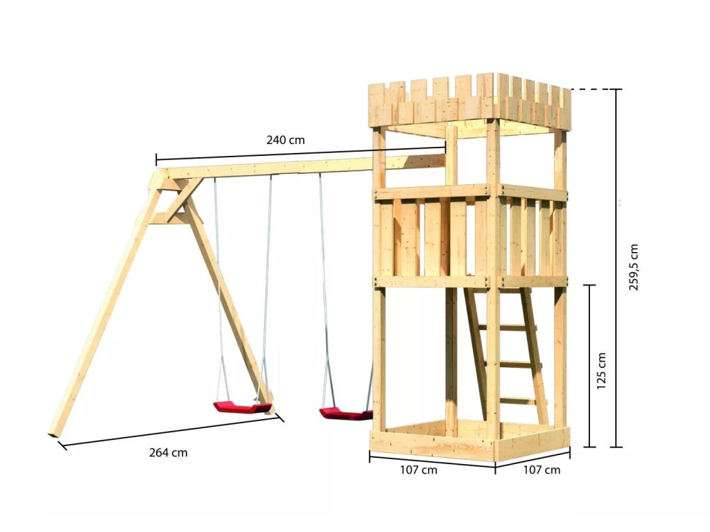 Dětské hřiště KARIBU LÖWENHERZ poskytuje dětem spoustu možností ke hrám. Nabízí vše k tomu, aby děti mohly prožít veškeré své hrací fantazie. Stejně jako u všech našich dětských hřišť i u modelu KARIBU LÖWENHERZ používáme výhradně to nejlepší smrkové dřevo. Hřiště má nosné sloupy o tloušťce 68 x 68 mm a je vyrobené z dřevěných profilů o síle 18 mm (spoje v systému pero / drážka). Naše dřevo pochází ze vzdáleného severu Evropy a je chemicky naprosto neošetřené. V důsledku toho je prosté všech známých problematických látek. Díky výšce plošiny 125 cm nabízí hřiště KARIBU LÖWENHERZ dětem dokonalý výhled na zahradu. Hřiště je standardně vybaveno robustním dřevěným žebříkem se 4 příčkami a pískovištěm pod věží. Dětské hřiště KARIBU LÖWENHERZ má samozřejmě certifikát TÜV Nord ověřující bezpečnost výrobku (GS) podle DIN EN 71-1, DIN EN 71-3, DIN EN 71-8 a AfPS GS 2014.