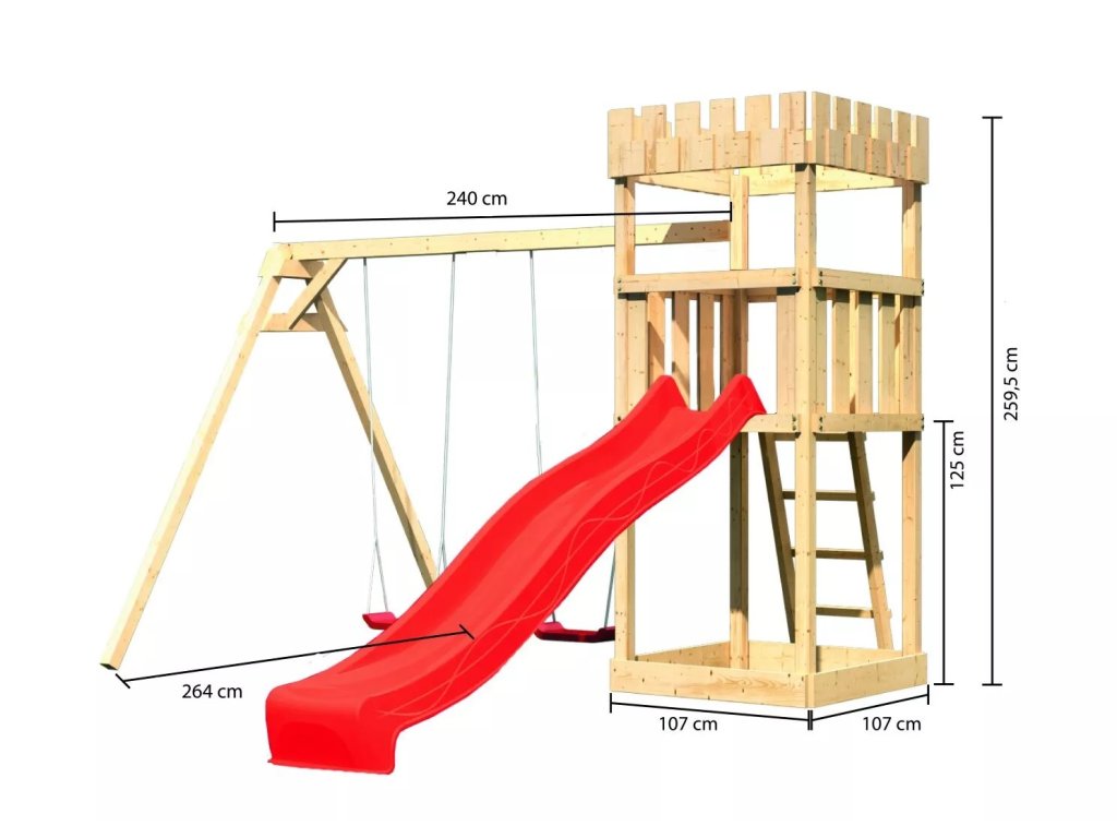 Dětské hřiště KARIBU LÖWENHERZ - červená skluzavka, dvakrát houpačka a pískoviště