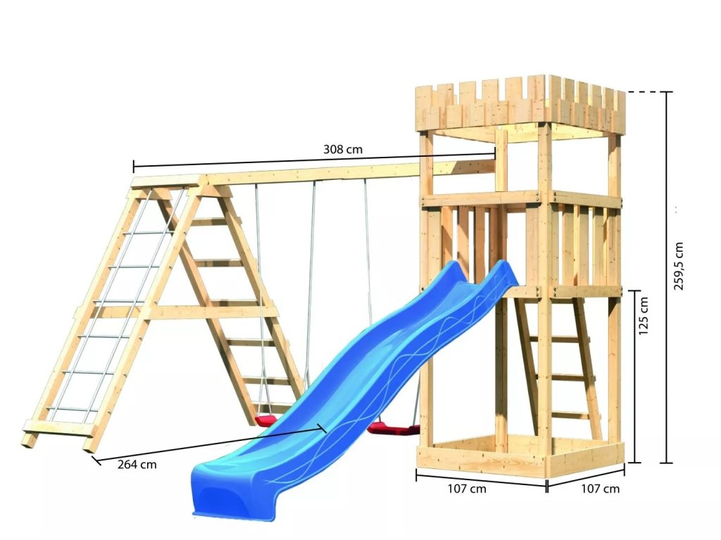 Dětské hřiště KARIBU LÖWENHERZ - modrá skluzavka, dvakrát houpačka, pískoviště a žebřík