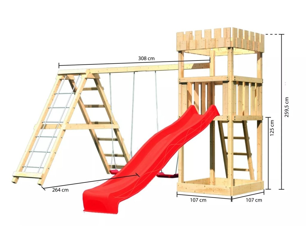 Dětské hřiště KARIBU LÖWENHERZ - červená skluzavka, dvakrát houpačka, pískoviště a žebřík