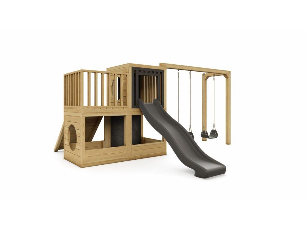 Navzdory svým kompaktním rozměrům nabízí sestava mnoho možností ke hře: kompaktní pískoviště, lezeckou stěnu, místo pro montáž skluzavky a základnu pro houpačku a gymnastické tyče nebo síť na lezení – nechte své dítě, ať si vybere!
