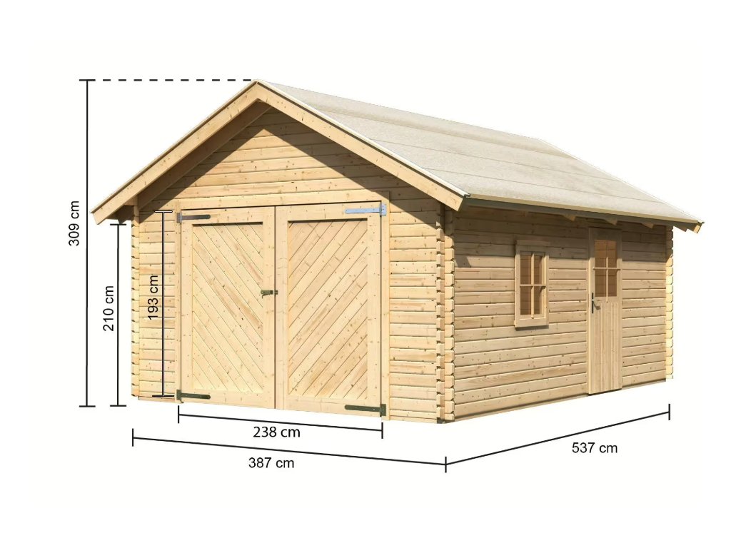 Garáž z přírodního dřeva pro středně velké vozidlo. S tloušťkou stěny 40 mm nabízí jistotu a stabilitu bytelné dřevostavby. Vjezd do garáže je zajištěn velkou dvoukřídlou dřevěnou branou š 238 x v 193 cm. Pokud tuto bránu dokořán otevřete, máte přístup k velkému interiéru o rozměrech š 365 x 514 cm. V boční stěně je možný vstup klasickými dveřmi š 82,5 x v 170 cm s přídavným okénkem. Pokud nechcete vyjíždět ven, ale pouze chcete do auta uložit věci, tak nemusíte otevírat velkou bránu, ale můžete využít menší dveře. Šikmá střecha z masivních dřevěných desek zajišťuje dlouhodobou ochranu proti povětrnostním vlivům.