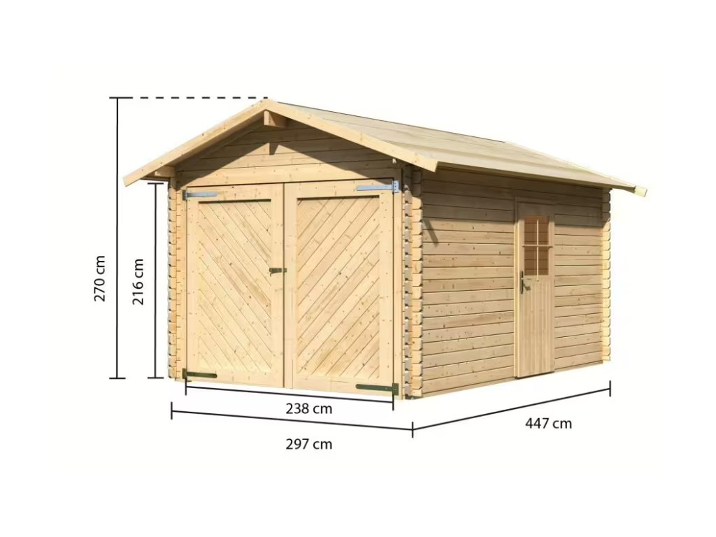 Garáž z přírodního dřeva pro menší vozidlo. S tloušťkou stěny 28 mm nabízí jistotu a stabilitu bytelné dřevostavby. Vjezd do garáže je zajištěn velkou dvoukřídlou dřevěnou branou š 238 x v 193 cm. Pokud tuto bránu dokořán otevřete, máte přístup k velkému interiéru o rozměrech š 274 x 424 cm. V boční stěně je možný vstup klasickými dveřmi š 82,5 x v 170 cm s přídavným okénkem. Pokud nechcete vyjíždět ven, ale pouze chcete do auta uložit věci, tak nemusíte otevírat velkou bránu, ale můžete využít menší dveře. Šikmá střecha z masivních dřevěných desek zajišťuje dlouhodobou ochranu proti povětrnostním vlivům.