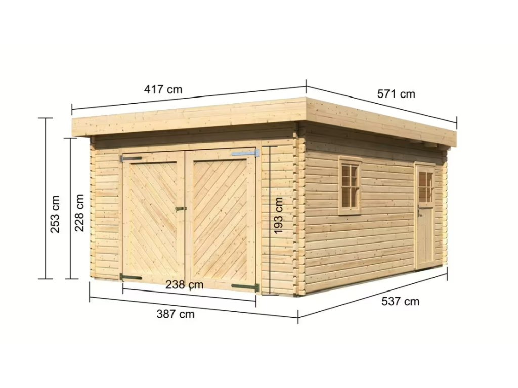 Garáž z přírodního dřeva pro středně velké vozidlo. S tloušťkou stěny 40 mm nabízí jistotu a stabilitu bytelné dřevostavby. Vjezd do garáže je zajištěn velkou dvoukřídlou dřevěnou branou š 238 x v 193 cm. Pokud tuto bránu dokořán otevřete, máte přístup k velkému interiéru o rozměrech š 365 x 514 cm. V boční stěně je možný vstup klasickými dveřmi š 82,5 x v 170 cm s přídavným okénkem. Pokud nechcete vyjíždět ven, ale pouze chcete do auta uložit věci, tak nemusíte otevírat velkou bránu, ale můžete využít menší dveře. Šikmá střecha z masivních dřevěných desek zajišťuje dlouhodobou ochranu proti povětrnostním vlivům.