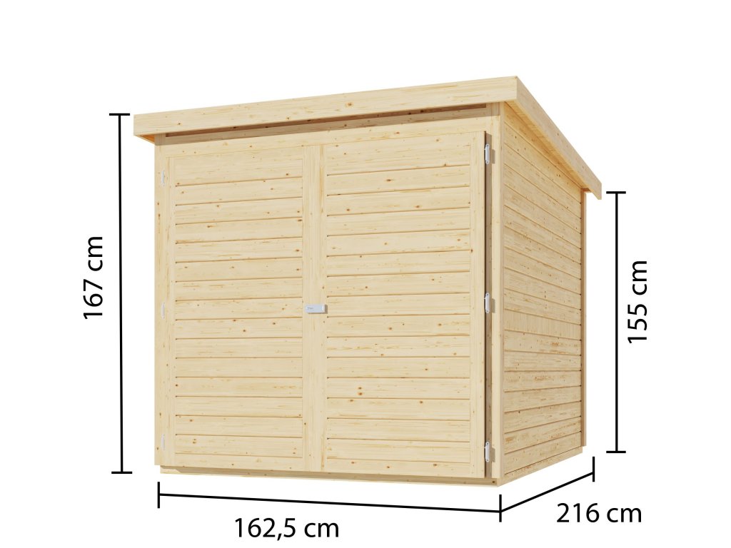 Garáž pro 3 jízdní kola. Tento model má pultovou střechu a dvoukřídlé dveře na pantech. Stavebním materiálem garáže jsou dřevěné profily síly 19 mm perfektně vyfrézované ze severského smrku. Dodáváme jako stavebnici v rozloženém stavu, kde stěny tvoří jednotlivé dřevěné profily, které pouze sesadíte k sobě a sešroubujete, střechu tvoří celistvá deska. To garantuje extrémně jednoduchou montáž, kterou zvládne každý český kutil. Garáž na kola navíc obsahuje police a držáky na pneumatiky kol.
