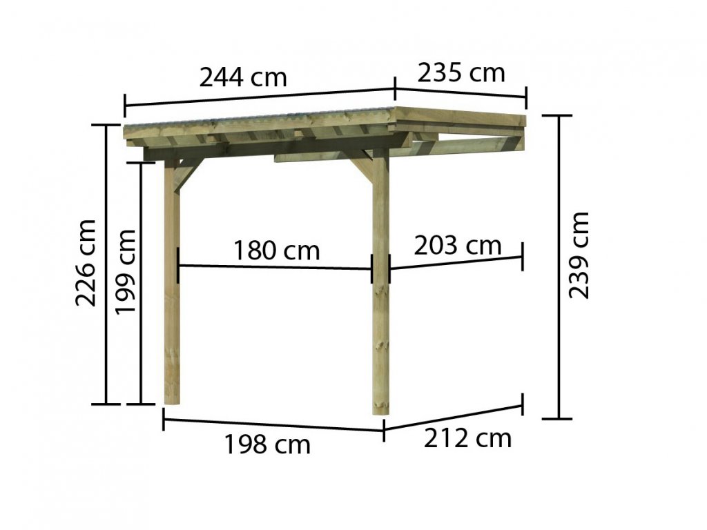 Dřevěná pergola ke zdi je vyrobená v Německu renomovanou firmou KARIBU HOLZTECHNIK z tlakově impregnovaného borovicového dřeva. Dřevěná pergola Vás ochrání před nepříznivým počasím. Díky tomu si na své zahradě vytvoříte oázu klidu a užijete si naplno venkovní posezení s rodinou a přáteli. Je ideální pro zastřešení terasy či verandy, nebo jako přístřešek pro automobil – carport. Konstrukce je z tlakově impregnovaného borovicového dřeva s nosnými sloupy o průměru 9 x 9 cm. Konstrukce se hlavně vyznačuje zvýšenou odolností vůči povětrnostním vlivům. Pergola je zastřešená z lehce namodralých průhledných PVC trapézových desek.
