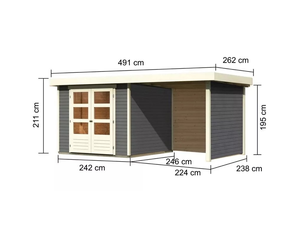 Schéma: Dřevěný domek KARIBU ASKOLA 3,5 + přístavek 2,4 m včetně zadní  a boční stěny, Šedý