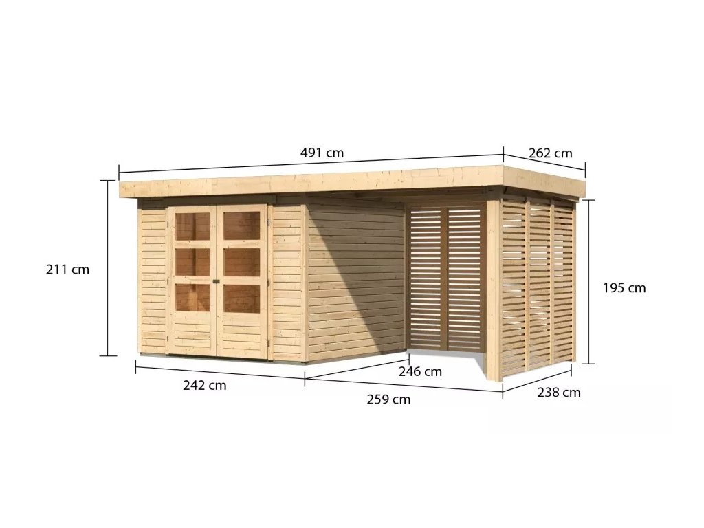 Schéma: Dřevěný domek KARIBU ASKOLA 3,5 + lamelový přístavek 2,4 m včetně zadní a boční stěny