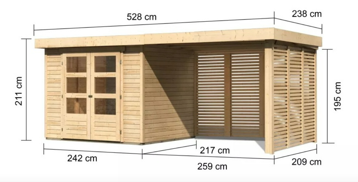 Schéma: Dřevěný domek KARIBU ASKOLA 3 + lamelový přístavek 2,80 m včetně zadní a boční stěny