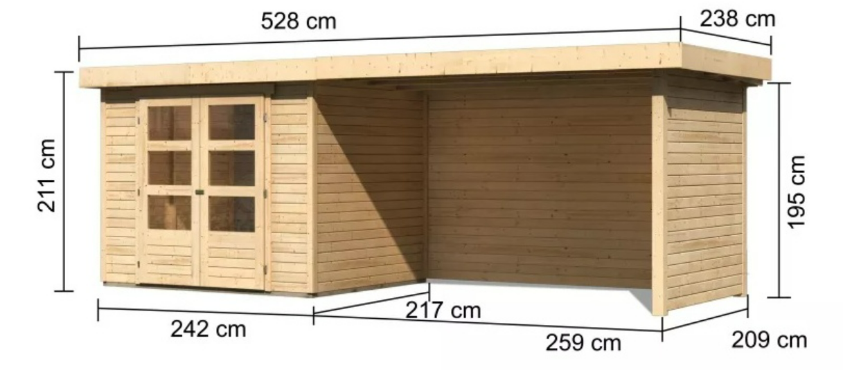 Schéma: Dřevěný domek KARIBU ASKOLA 3 + přístavek 2,8 m včetně zadní a boční stěny