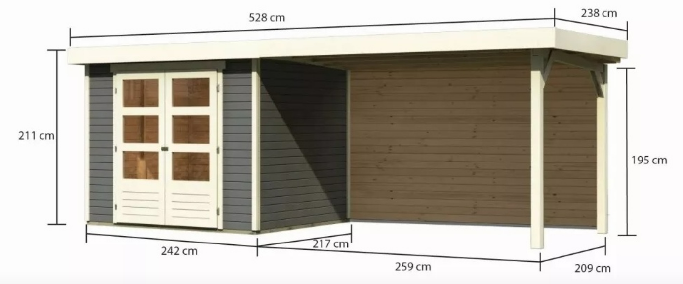Schéma: Dřevěný domek KARIBU ASKOLA 3 + přístavek 2,8 m včetně zadní stěny, Šedý