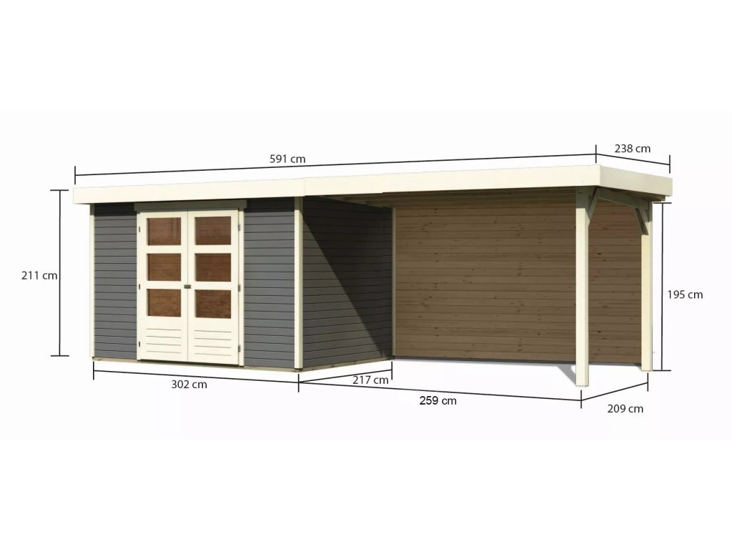 Schéma: Dřevěný domek KARIBU ASKOLA 4 + přístavek 2,8 m včetně zadní stěny Šedý