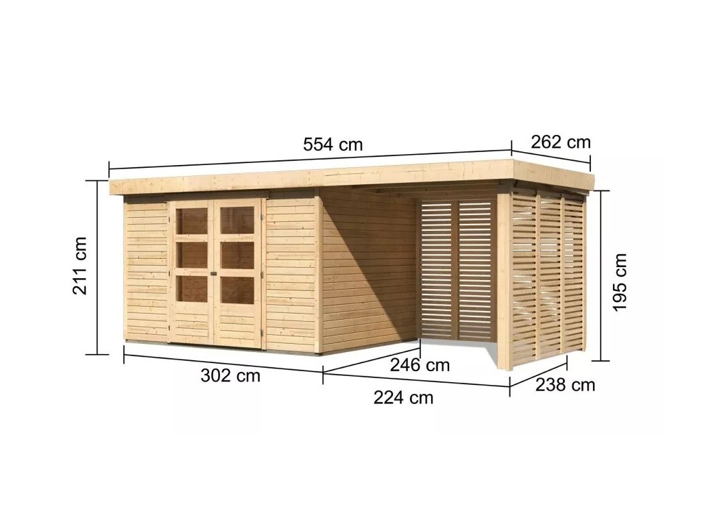 Dřevěný domek KARIBU ASKOLA 5 + přístavek 2,4 m včetně zadní a boční lamelový stěny