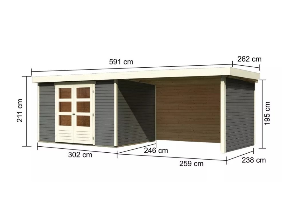Dřevěný domek KARIBU ASKOLA 5 + přístavek 2,8 m včetně zadní a boční stěny Šedý