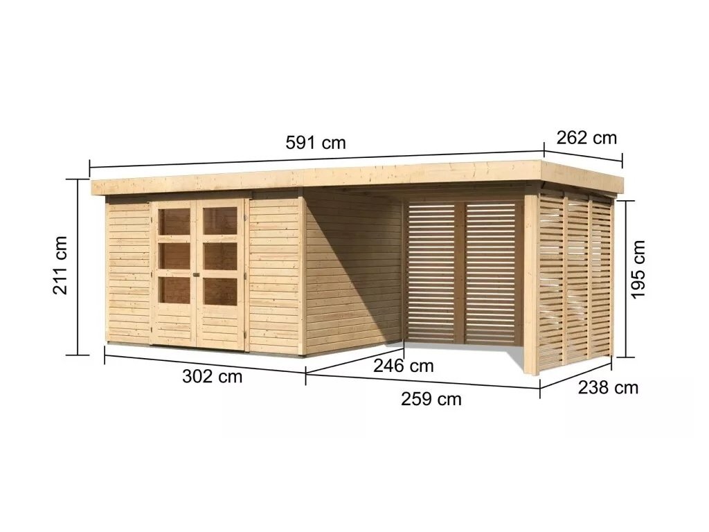Dřevěný domek KARIBU ASKOLA 5 + lamelový přístavek 2,8 m včetně zadní a boční stěny
