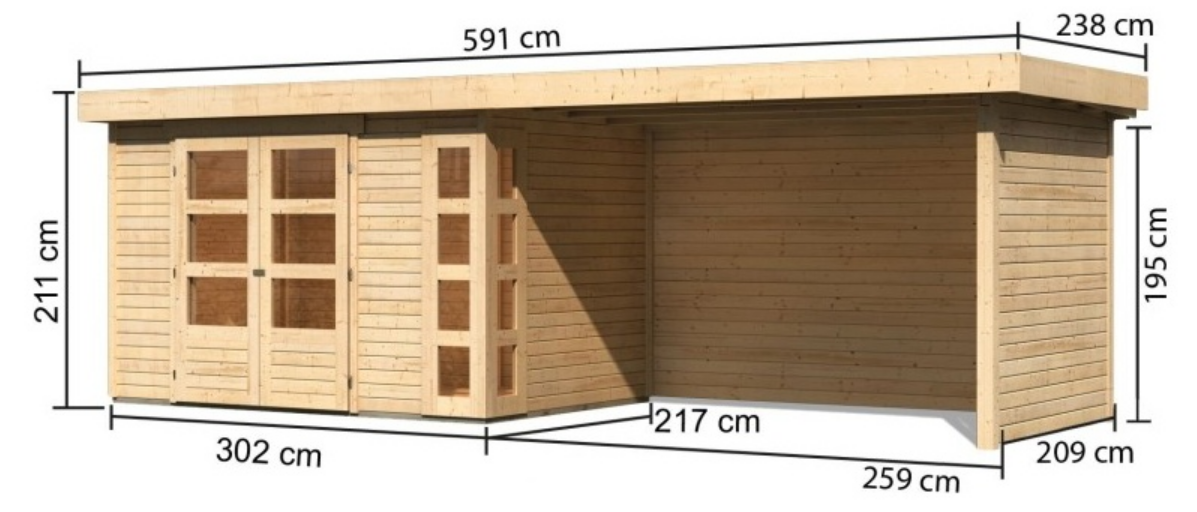 Schéma: Dřevěný domek KARIBU KERKO 4 + přístavek 2,8 m včetně zadní a boční stěny