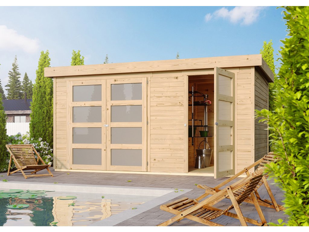 Dřevěný zahradní domek nejvyšší kvality, s precizním zpracováním, s klasickou pultovou střechou se sklonem 4o, dvoukřídlými a jednokřídlými dveřmi s čtyřmi okny v každém křídle. Dvě místnosti se samostatným vchodem. Prosklení oken z plastového skla - plexiskla. Zahradní domek KARIBU je vyrobený v Německu renomovanou společností Karibu Holztechnik v závodech Klosterfelde - Brandenburg nebo Brémy. Dřevěný domek se snoubí s nejlepší funkčností a jedinečným designem. Vyznačuje se vysokou úrovní dílenského zpracování. Dřevěné profily o tloušťce 19 mm jsou perfektně vyfrézované ze severského smrku. Zahradní domky mohou sloužit jak pro rekreaci, tak i pro uschování nářadí, zahradní techniky a zahradního nábytku nebo i jako domeček pro děti. Zahradní domek KARIBU MÜHLENTRUP 2 je vhodný k uskladnění zahrádkářských, grilovacích, campingových, bazénových, sportovních a motoristických potřeb...
