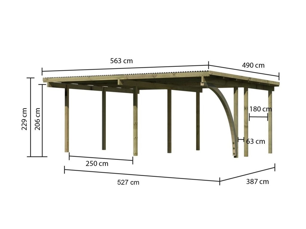 Přístřešek má obdélníkový tvar a svými rozměry vyhovuje většině modelů vozidel běžných na českém trhu. Celková zastřešená plocha je 5,63 x 4,90 m. Průjezdná výška je 206 cm. Střechu podpírá devět dřevěných sloupků 9 x 9 cm. Konstrukce přístřešku je tlakově impregnována a je tak dobře chráněna proti dřevokazným houbám i hmyzu, ale i proti nepříznivým povětrnostním podmínkám. Impregnace je zdravotně nezávadná a naprosto bezpečná. Vzhledem k velkým plochám střechy a zatížení větrem je nutné připevnit přístřešek k zemi pomocí odpovídajících zemních kotev (nejsou obsahem dodávky - lze dokoupit jako příplatkové příslušenství).