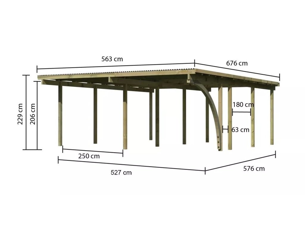 Přístřešek má obdélníkový tvar a svými rozměry vyhovuje většině modelů vozidel běžných na českém trhu. Celková zastřešená plocha je 5,63 x 6,76 m. Průjezdná výška je 206 cm. Střechu podpírá dvanáct dřevěných sloupků 9 x 9 cm. Konstrukce přístřešku je tlakově impregnována a je tak dobře chráněna proti dřevokazným houbám i hmyzu, ale i proti nepříznivým povětrnostním podmínkám. Impregnace je zdravotně nezávadná a naprosto bezpečná. Vzhledem k velkým plochám střechy a zatížení větrem je nutné připevnit přístřešek k zemi pomocí odpovídajících zemních kotev (nejsou obsahem dodávky - lze dokoupit jako příplatkové příslušenství).