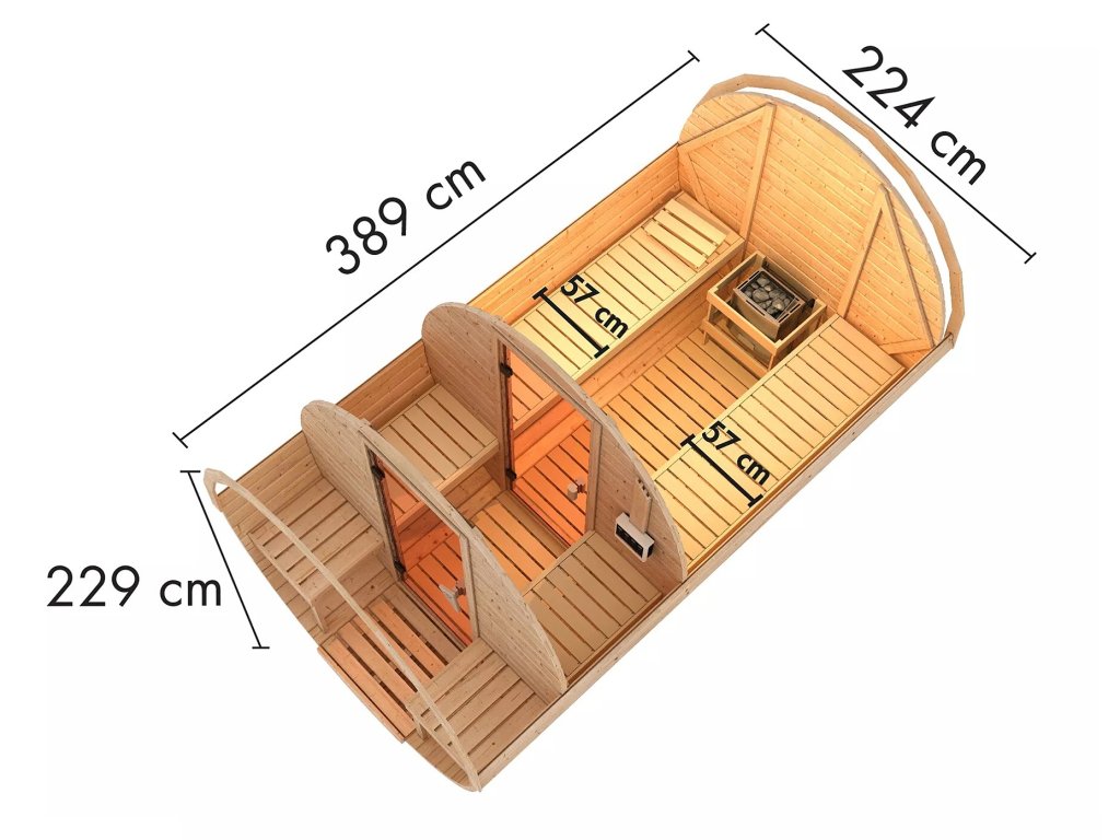 Moderní finská venkovní sauna nejvyšší kvality, s precizním zpracováním určena pro dvě ležící osoby vyrobena ze severského masivního smrku o síle stěny 38 mm. Dveře jsou kouřově hnědé z skla o síle 8 mm, můžete instalovat jako levé nebo pravé. Rozměr dveří je 64 x 173 cm. Sauna je vybavena dvěma lavicemi z osikového dřeva o šířce 55 cm s nosností až 250 kg a dřevěným ochranným rámem na kamna ze smrkového dřeva. Podlaha je vyrobená masivních prken o síle 28 mm.