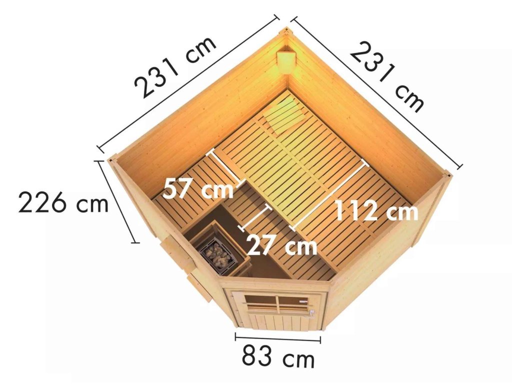 Designová rohová finská venkovní sauna nejvyšší kvality, s precizním zpracováním určena pro tři ležící osoby vyrobena ze severského masivního smrku o síle stěny 38 mm a izolovanými dřevěnými dveřmi s čirým izolačním sklem a zámkem se 3 klíči. Průchozí rozměr dveří je 83 x 177 cm. Sauna je vybavena třemi lavicemi z osikového dřeva o šířce 112, 57 a 27 cm s nosností až 250 kg, dřevěným ochranným rámem na kamna v rozměru 60 x 80 x 51 cm ze smrkového dřeva. Podlaha je vyrobená z tlakově impregnovaných masivních palubek 96 mm širokých a 19 mm silných. Pultová střecha se sklonem 3° z dřevěných palubek. Aby teplo z vnitřních prostor sauny nemohlo unikat, je instalován druhý strop z rámové konstrukce s minerální izolační vatou o tloušťce 42 mm.