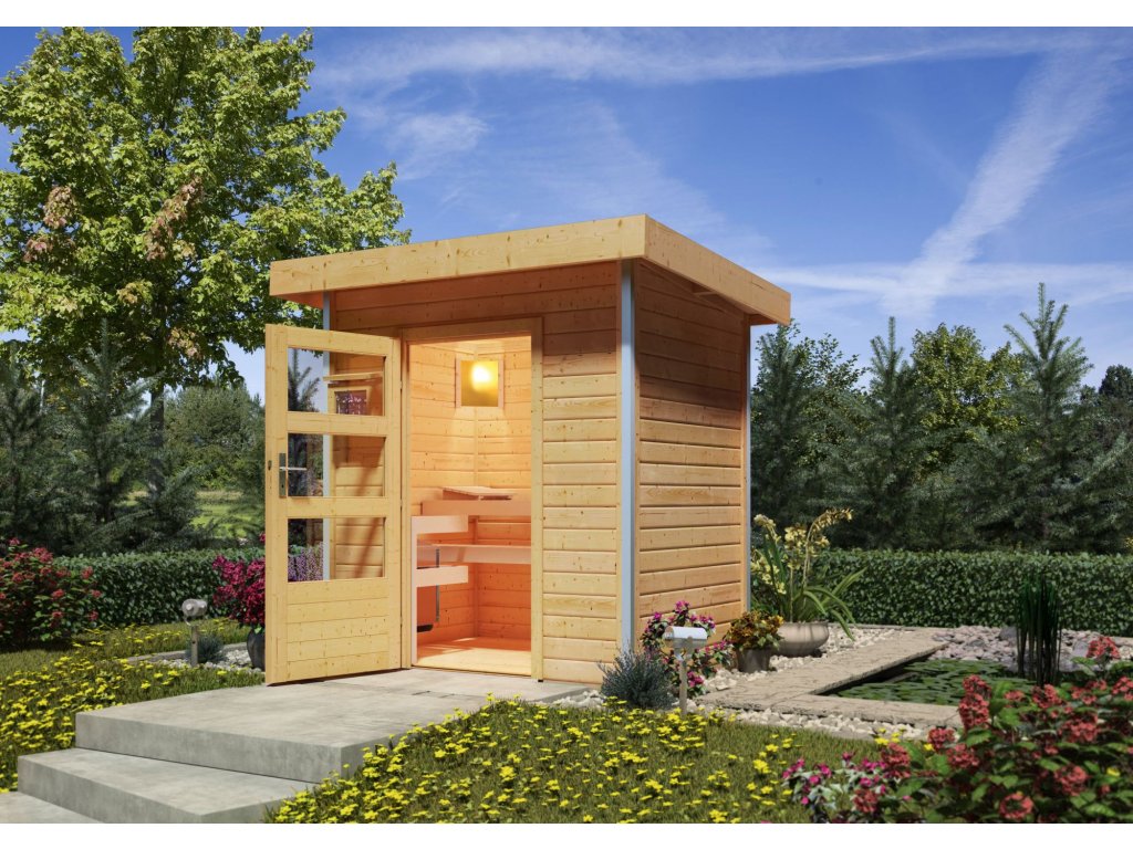 Moderní finská venkovní sauna s chromovými rohovými lištami nejvyšší kvality, s precizním zpracováním určena pro dvě ležící osoby vyrobena ze severského masivního smrku o síle stěny 38 mm a izolovanými dřevěnými dveřmi s čirým izolačním sklem a zámkem se 3 klíči. Dveře můžete instalovat pouze jako levé. Průchozí rozměr dveří je 78 x 175 cm. Sauna je vybavena dvěma lavicemi z osikového dřeva o šířce 57 cm a 27 cm s nosností až 250 kg, dřevěným ochranným rámem na kamna v rozměru 60 x 80 x 51 cm ze smrkového dřeva. Podlaha je vyrobená z tlakově impregnovaných masivních palubek 96 mm širokých a 19 mm silných. Aby teplo z vnitřních prostor sauny nemohlo unikat, je instalován druhý strop z rámové konstrukce s minerální izolační vatou o tloušťce 42 mm.