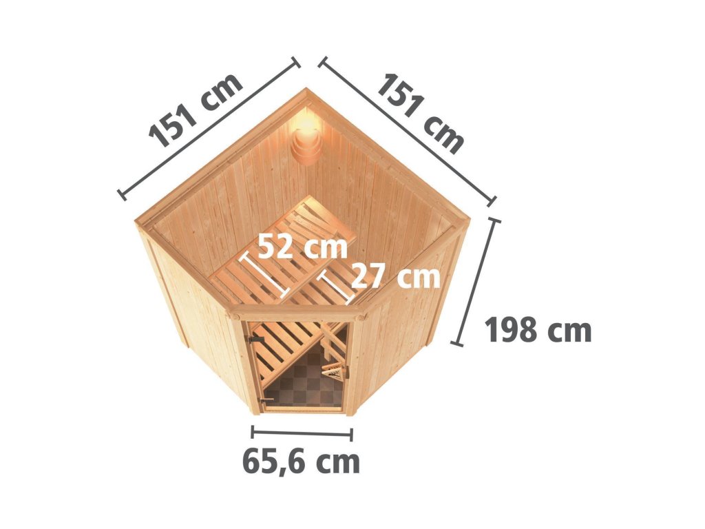 Malá finská sauna určená až pro dvě osoby. Má rozměr 151 x 151 cm s rohovými dveřmi. Tento model finské sauny je určený do temperovaných interiérů domu nebo bytu. Její výrobce, firma KARIBU HOLZTECHNIK z německých Brém, dokázala svými výrobky úspěšně navázat na staletou tradici skandinávského saunování a současně do ní zapracovat dnešní moderní technologie. Sauna je celá vyrobena ze dřeva severského smrku v přírodním provedení. Dřevo pochází ze vzdáleného severu Evropy a je chemicky naprosto neošetřené (není ani namořeno ani nalakováno). V důsledku toho je prosté všech známých problematických látek, které by se v průběhu saunování mohly ze dřeva uvolňovat. Tato interiérová sauna vykazuje mimořádné tepelně-izolační vlastnosti. Stěny sauny jsou složeny z vnitřní a vnější vrstvy speciálně hlazených prken s perem a drážkou, mezi kterými je 42 mm silná tepelná izolace v podobě minerální vlny. Celková síla stěny je tak 68 mm. Zadní nebo boční nepohledové strany orientované ke stěně místnosti mají vnější stranu ze sololitu. Proto jsou při stejné tepelné izolaci o cca 10 mm tenčí než pohledové strany pokryté palubkami.