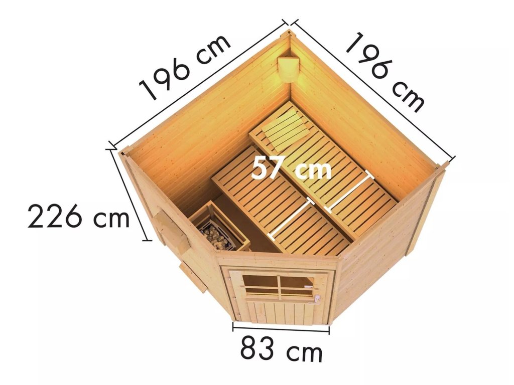 Designová rohová finská venkovní sauna nejvyšší kvality, s precizním zpracováním určena pro dvě ležící osoby vyrobena ze severského masivního smrku o síle stěny 38 mm a izolovanými dřevěnými dveřmi s čirým izolačním sklem a zámkem se 3 klíči. Průchozí rozměr dveří je 83 x 177 cm. Sauna je vybavena dvěma lavicemi z osikového dřeva o šířce 57 cm s nosností až 250 kg, dřevěným ochranným rámem na kamna v rozměru 60 x 80 x 51 cm ze smrkového dřeva. Podlaha je vyrobená z tlakově impregnovaných masivních palubek 96 mm širokých a 19 mm silných. Pultová střecha se sklonem 3° z dřevěných palubek. Aby teplo z vnitřních prostor sauny nemohlo unikat, je instalován druhý strop z rámové konstrukce s minerální izolační vatou o tloušťce 42 mm.